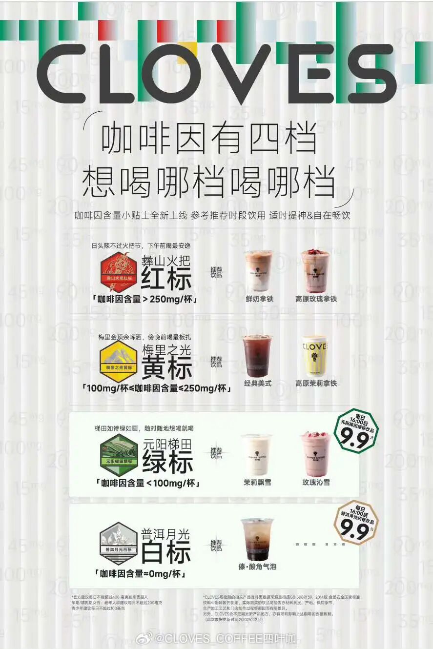云南本土咖啡品牌四叶咖,在今年三月就对旗下所有产品的咖啡因含量进行了测定与划分,并给饮品贴上了对应的等级标识。其分级标准共分为四类:红标代表每杯咖啡因含量250mg以上,黄标为100mg—250mg,绿标低于100mg,白标则表示不含咖啡因。