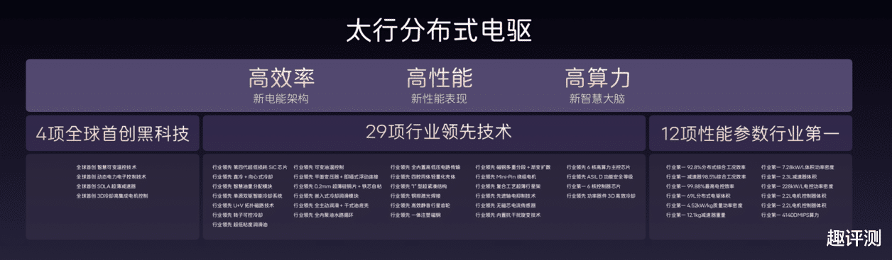 太行分布式电驱集4项全球首创黑科技,12项行业第一参数,29项行业领先的技术于一身,拥有高效率、高性能、高算力三大核心优势。电驱系统工况效率超92.8%,全球第一,功率大幅提升的同时续航几乎零折损;体积功率密度行业第一,以更小体积释放更强马力,新阿维塔12三电机四驱版0-100km/h加速仅2.71秒,媲美500万级超跑;算力方面搭载全球最高六核电机控制器芯片,每秒处理40亿条指令,带来闪电般的扭矩响应和精细入微的控制,通过对左右两个电机进行超精密的独立控制,提供超过传统机械四驱100倍的扭矩响应速度。此外,新阿维塔12还搭载了法拉利同款电磁避震,支持全段阻尼无级调整,每秒千次的调整能力,紧急场景下快速抑制车身侧倾与俯仰,完美平衡日常舒适性与运动操控性。