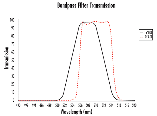 物理原理:随着入射角(AOI)的增加,光线穿过滤光片膜层的光程变长,导致中心波长向短波方向移动——这就是“蓝移”。