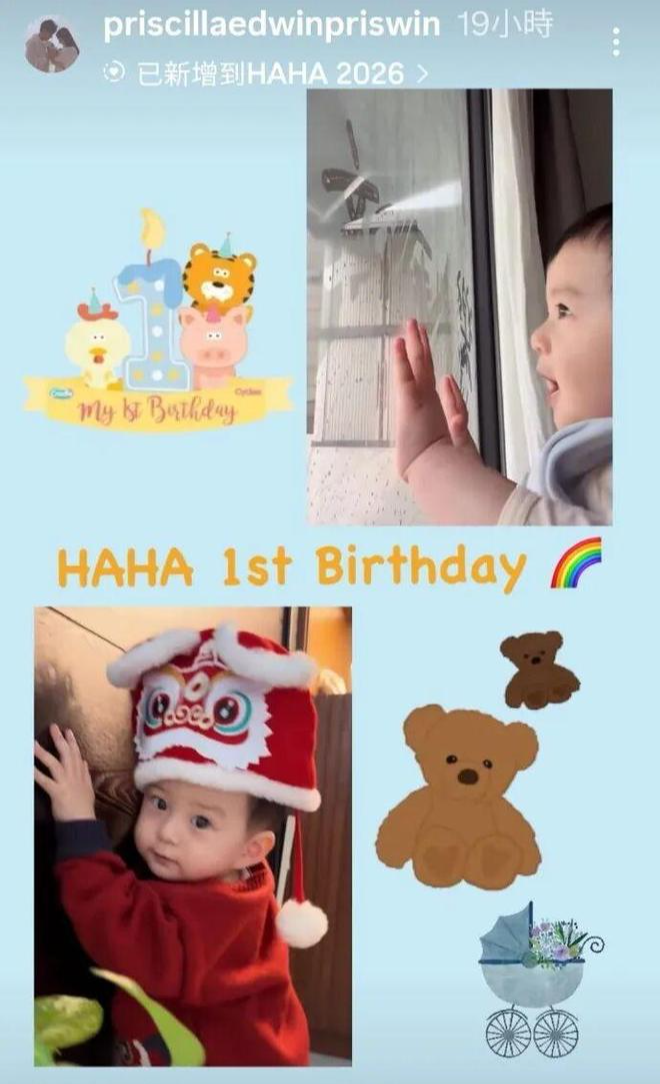 此外,翠如前晚在分享家庭日常的社交账号祝贺儿子1岁生日,其中一张相中“萧哈哈”戴上红色狮头公仔帽和红色衫;