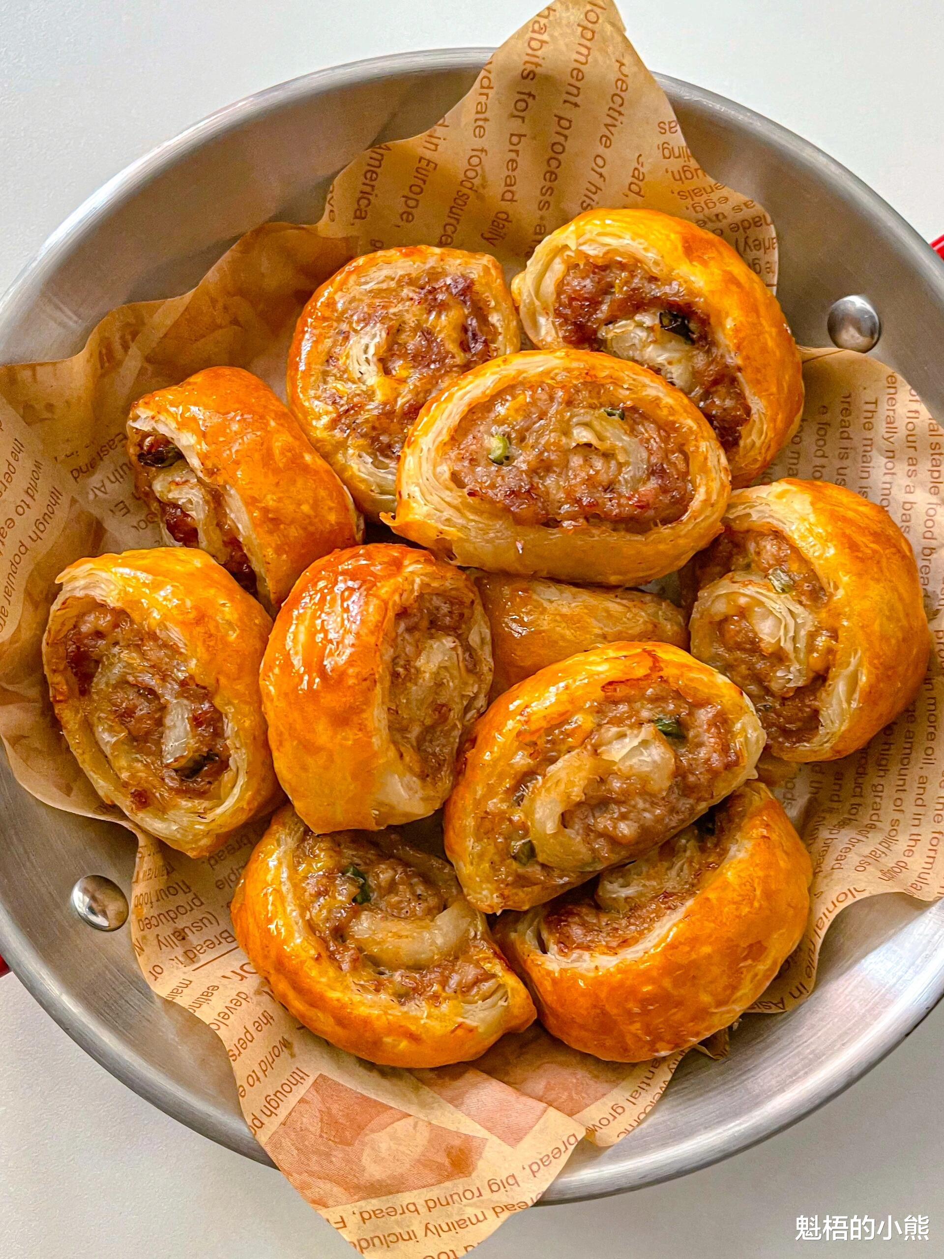 出炉的小卷金灿灿的,油亮亮的,肉香和葱香直往鼻子里钻。拿一个咬一口,外皮酥脆得掉渣,“咔嚓”一声,里面的肉馅鲜嫩多汁,葱花在嘴里爆香。那种外酥里嫩、满口肉香的感觉,让人一个接一个停不下来。女儿一口气吃了四个,边吃边说妈妈这个太好吃了。