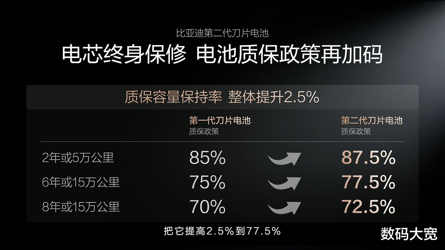 卓越的技术性能是品质承诺的基石,比亚迪同步宣布第二代刀片电池质保政策全面加码,为用户送上最强定心丸。比如在6年或15万公里质保周期内,电池容量保持率标准由75%提升至77.5%,容量低于该标准即可享受免费包换服务,保障标准更严苛、用户权益更丰厚。与此同时,第二代刀片电池电芯实现终身保修,覆盖车辆全使用周期,彻底打消用户对电池长期使用的后顾之忧,以实打实的政策,印证对电池寿命与品质的绝对信心。
