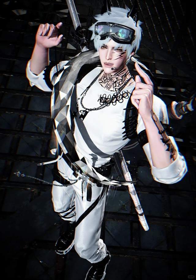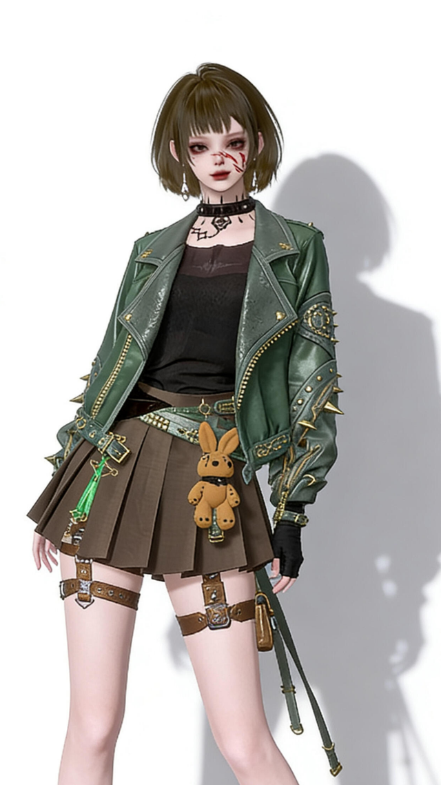 女款【寐影渡生】简直是又飒又甜的天花板,齐刘海短发利落干练,一出场就气场全开。上身以酷黑修身背心打底,外搭亮面皮质外套,衣身点缀的铆钉与金属配饰暗藏锋芒,又酷又拽氛围感拉满。下身搭配同色系百褶短裙,刚柔并济,在冷硬酷感里增添了几分灵动俏皮,又 A 又甜的风格谁看了不心动,随便截一张图都能直接当壁纸!