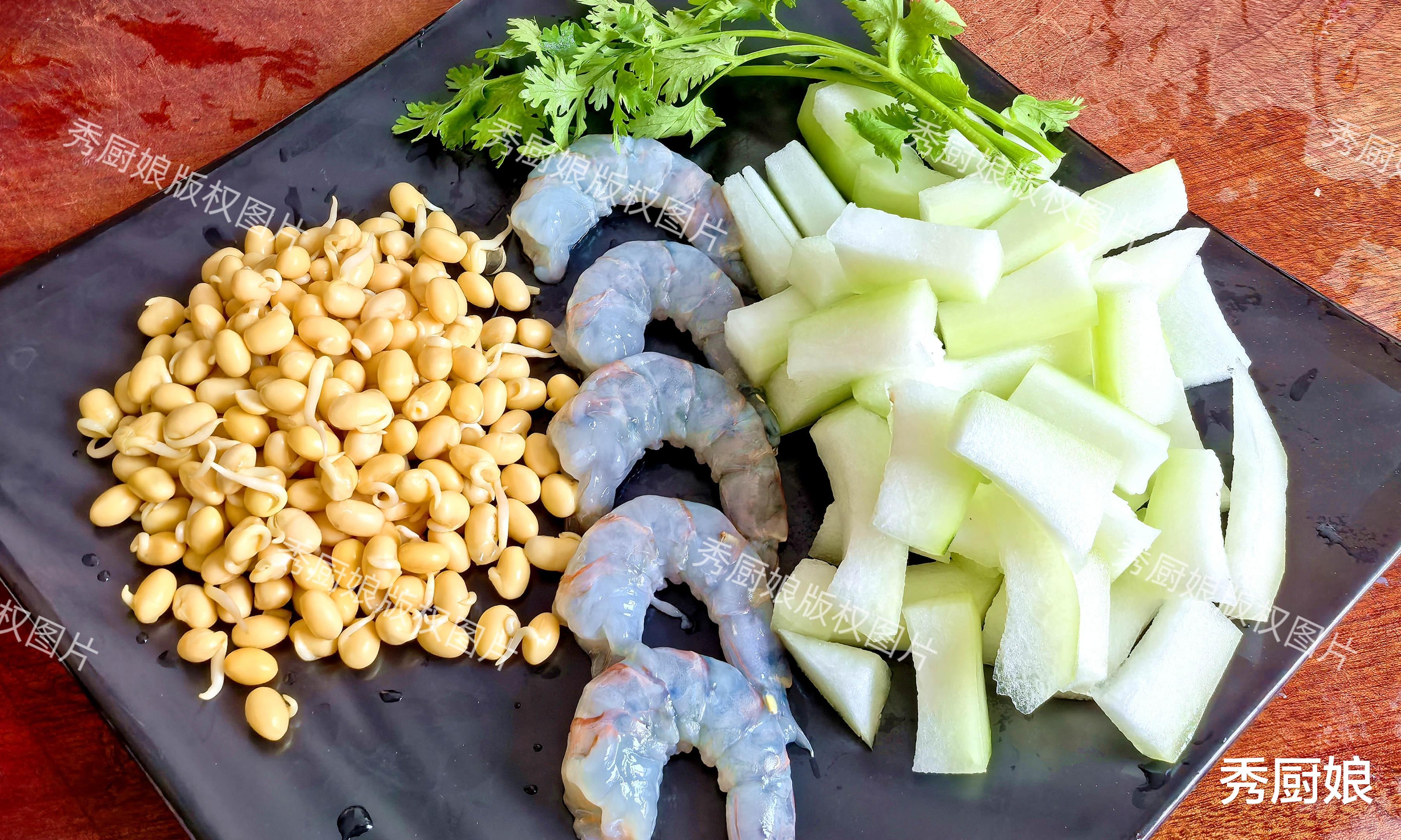 材料准备:冬瓜400克(去皮切块),黄豆100克(提前泡发),鲜虾200克(去壳取虾仁,虾头保留),姜片3片,香菜适量,食用油适量,清水适量,盐适量,胡椒粉少许。