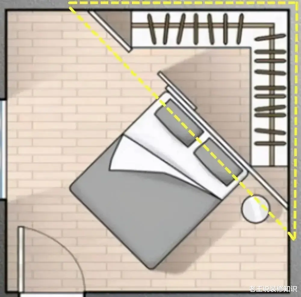 在面积较小的卧室中,这种布局方式同样适用。但由于床体与两侧墙体之间的角度小于90°,设置床头柜等家具时可能会受到一定限制,需要结合生活习惯进行考虑。