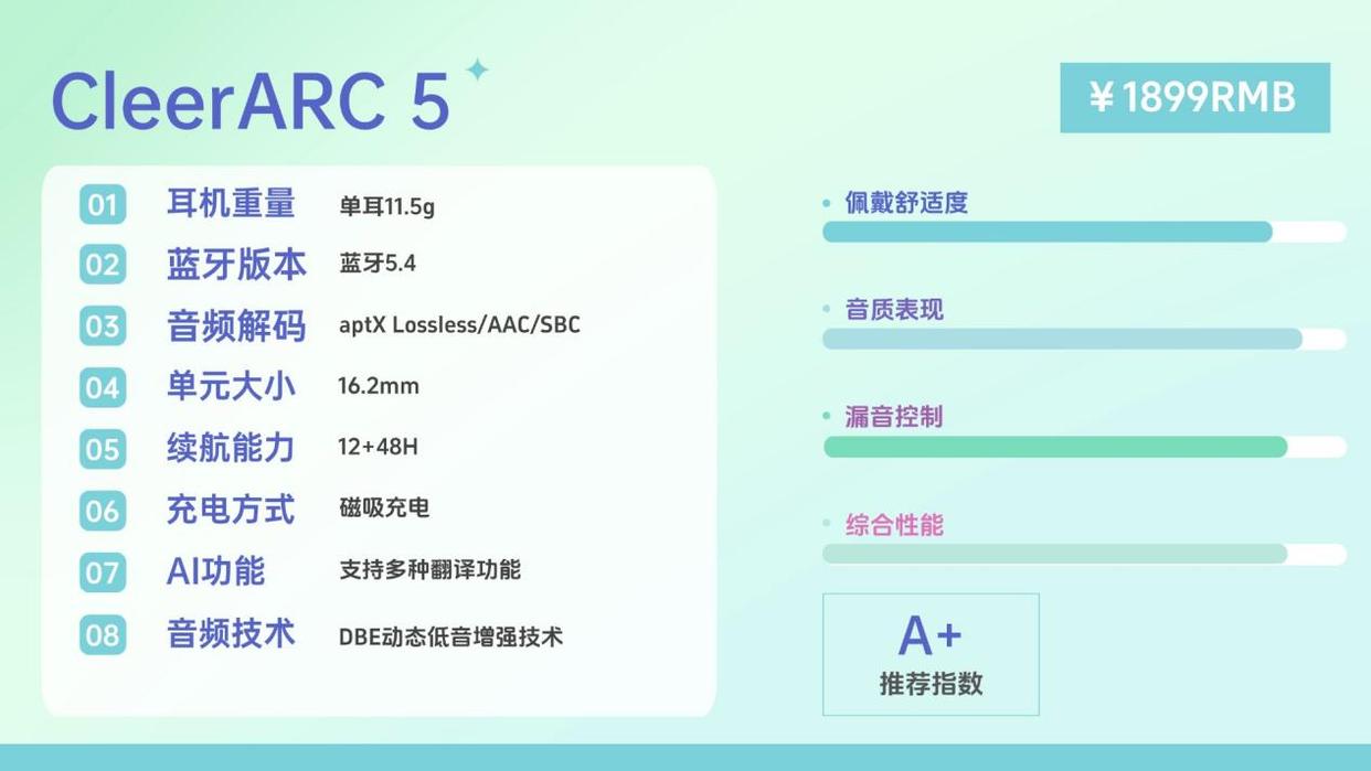 在音质呈现上,CleerARC5成为业内首款同时斩获THX认证且支持DTS技术的耳机产品,搭配杜比头部追踪功能,能够带来媲美影院级的沉浸式音效体验。它支持24bit/96kHz超CD级无损音频传输,搭载16.2mm钻石晶体复合振膜,声音细节饱满丰富,失真率极低,可实现高保真的音频输出。与此同时,该耳机配备了开放式AI降噪2.0与AIENC2.0双向通话技术,进一步强化了降噪效果与通话清晰度。