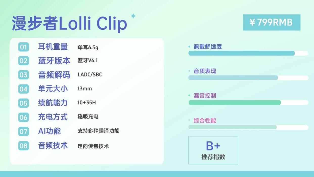 漫步者Lolli Clip不仅做工精良,还拥有精巧的机身尺寸,其产品形态介于半入耳式与耳夹式之间,佩戴时既稳固又舒适,几乎能适配各类不同的耳型。