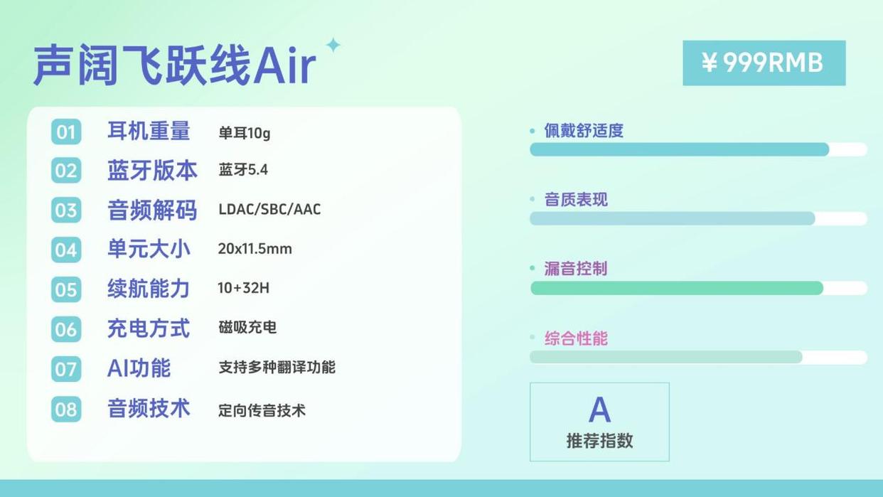 声阔飞跃线Air在佩戴设计上颇为考究,采用四档可调的自适应耳挂结构,能够根据不同用户的耳型实现精准贴合,既保证了佩戴的稳固性,又兼顾了舒适体验。耳挂内部嵌入柔韧钛丝骨架,既具备足够的支撑力,又保有良好弹性,外层还包裹了亲肤硅胶,即便长时间佩戴也能有效缓解耳部压迫感。