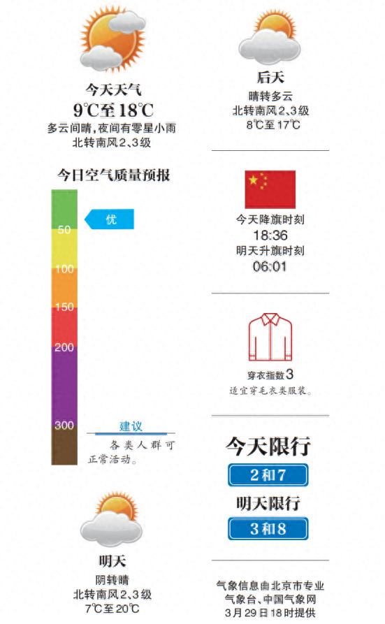 据“气象北京”消息,今天白天多云间晴,北转南风二三级,最高气温18℃;夜间多云转阴有零星小雨,山区有小雨,南转北风一二级