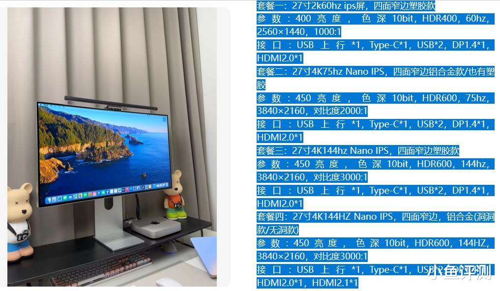 说回产品本身。卖家列出了四个套餐,咱们直接划重点:真正值得看的,是套餐三和套餐四。它们都搭载了那块传说中的LM270WRA-SSA1面板,这就是LG原厂27寸4K Nano IPS的核心,色准、通透度、响应速度的保障。450尼特亮度,HDR600认证,98% P3色域,这些参数对于这个价位来说,堪称“奢华”。区别在于外壳(塑料 or 全铝合金“洞洞款”)和接口(套餐四多了个HDMI 2.1)。