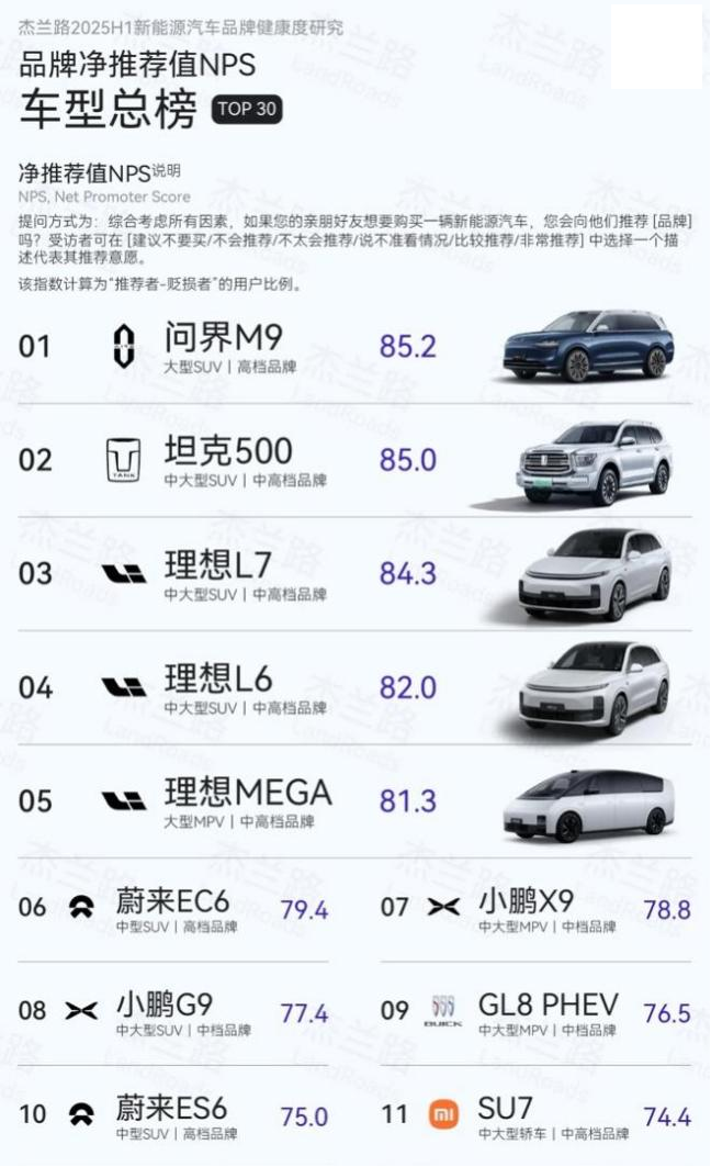 扎实的技术底气最终要转化为市场认可,而鸿蒙智行在这方面的表现同样令人印象深刻。根据杰兰路《2025年度上半年新能源汽车品牌健康度研究》,问界品牌位居品牌发展信心指数榜首,其旗舰车型问界M9更是以85.2分的高分夺得新能源车型净推荐值(NPS)总榜第一名。