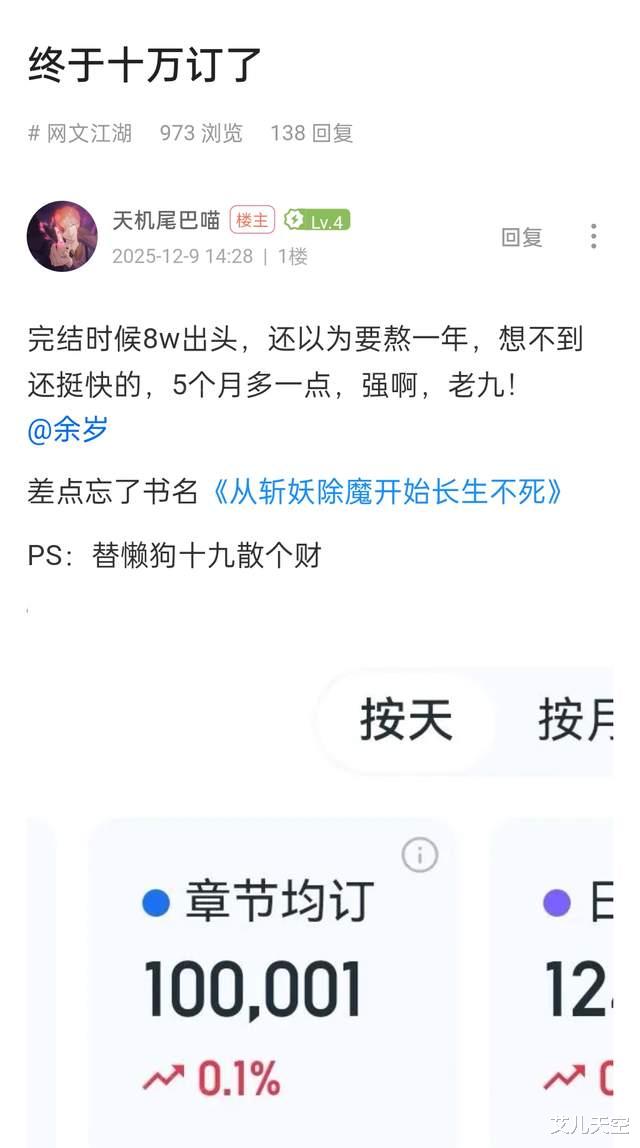 小说运营官“天机尾巴喵”今天在龙空发了庆祝帖,庆祝小说今天突破十万订。这也是今年起点第七本达成十万订的作品,七本里有三本是完结后成就的。