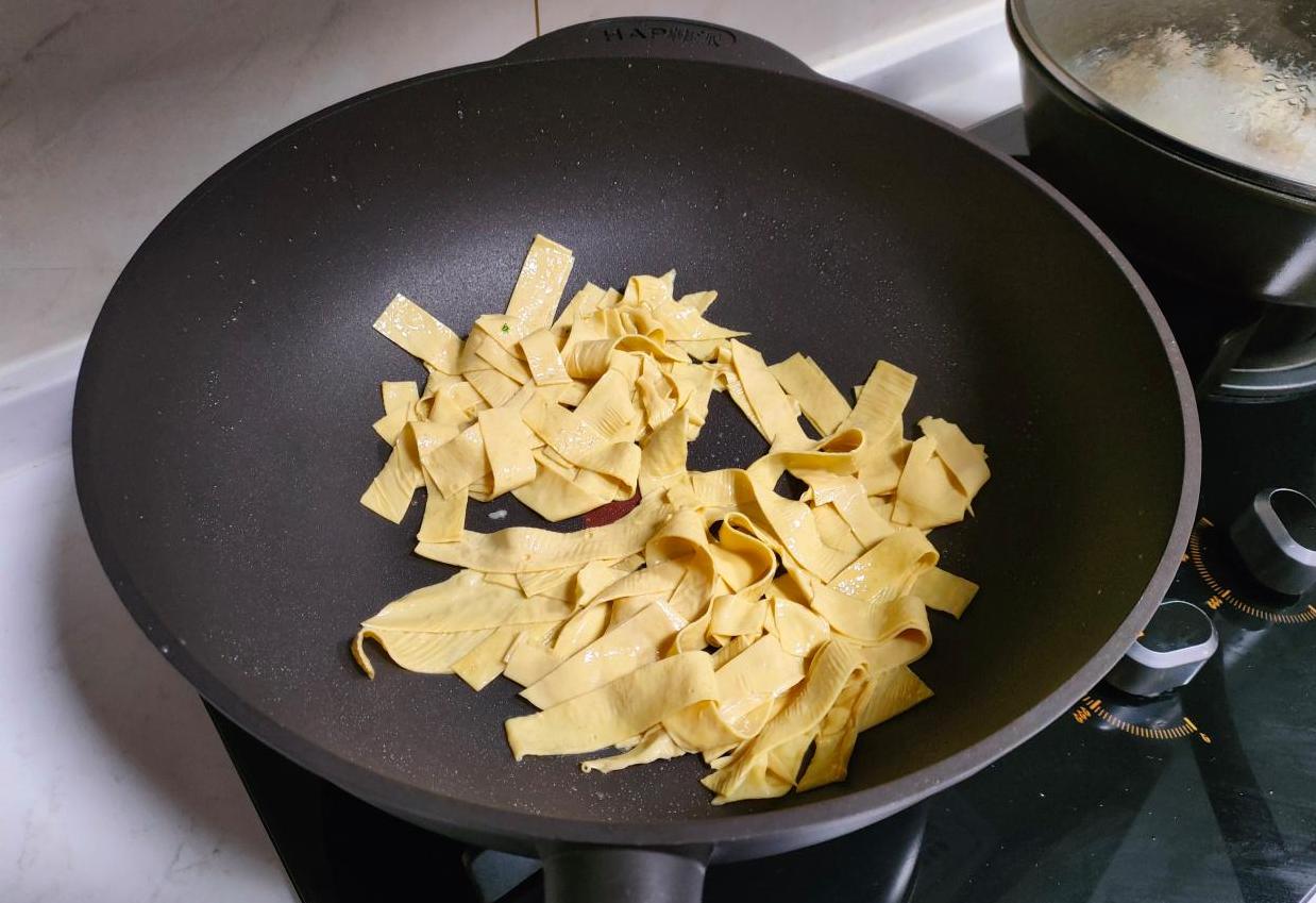 她从云南石屏买来的豆腐皮,切成短短的条状,泡软后,豆香浓郁,厚实中带着滑嫩。