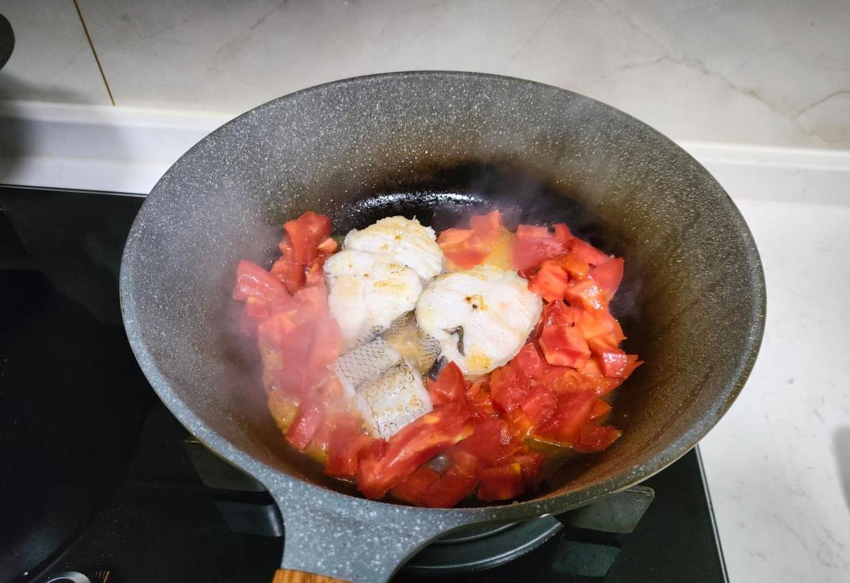 切成块的番茄稍事翻炒,汁液四溢,几乎不需要加水,天然的汤汁给鳕鱼增添了鲜美。