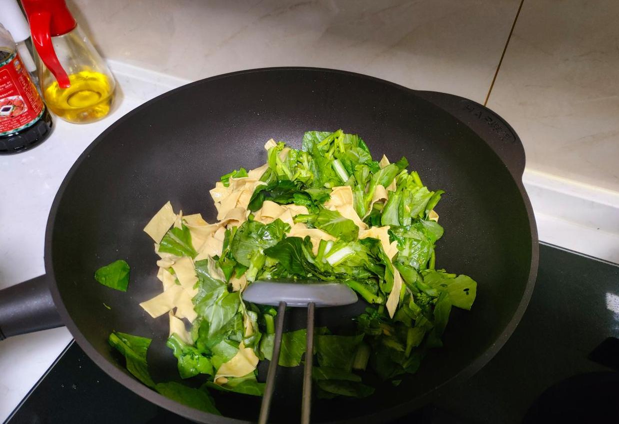 青菜在锅中刚刚翻炒几下,便和豆腐皮相融,简单的一道菜就能带来不凡的美味。