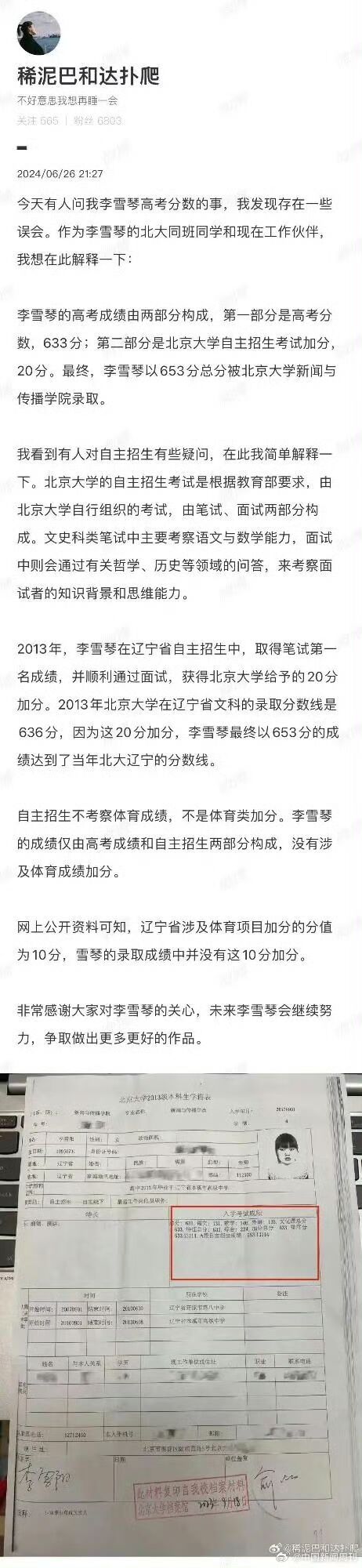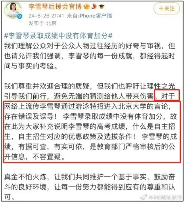 娱乐明星李雪琴在采访时透露“自己不会游泳”,而有网友爆料她是通过2013游泳二级运动员,获得北大自主招生降20分录取资格进入北大的,引起热议。6月26日,一位李雪琴的北大同班同学晒出入学成绩单为她发声,称李雪琴高考成绩中的20分自主招生考试加分和体育特长无关。同学称,李雪琴的高考成绩由两部分构成,一是高考分数633分,二是北京大学自主招生考试加分(20分),“自主招生不考察体育成绩,不是体育类加分。”此外,有人质疑李雪琴是否真的拥有二级游泳运动员证书。一位自称是同年高考的辽宁考生表示,李雪琴的游泳
