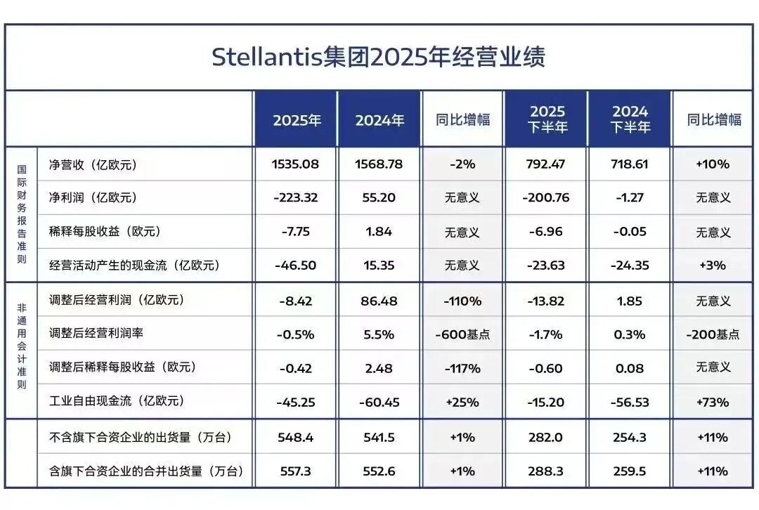 Stellantis在2025年净营收1535亿欧元,同比2024年下降2%,集团净亏损为223亿欧元(约1802.7亿人民币)。尽管这主要是由于集团为满足客户偏好而进行深度战略调整以及监管环境和监管框架变化等因素所产生的254亿欧元费用。但从2024年开始,连续性的亏损和销量下滑,使得这家曾经最赚钱的车企面临着巨大的生存危机。