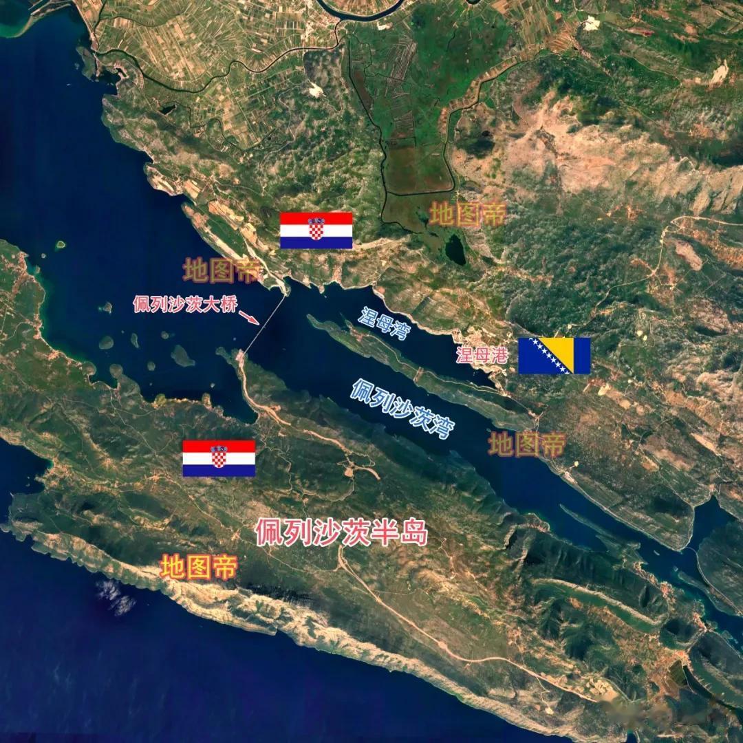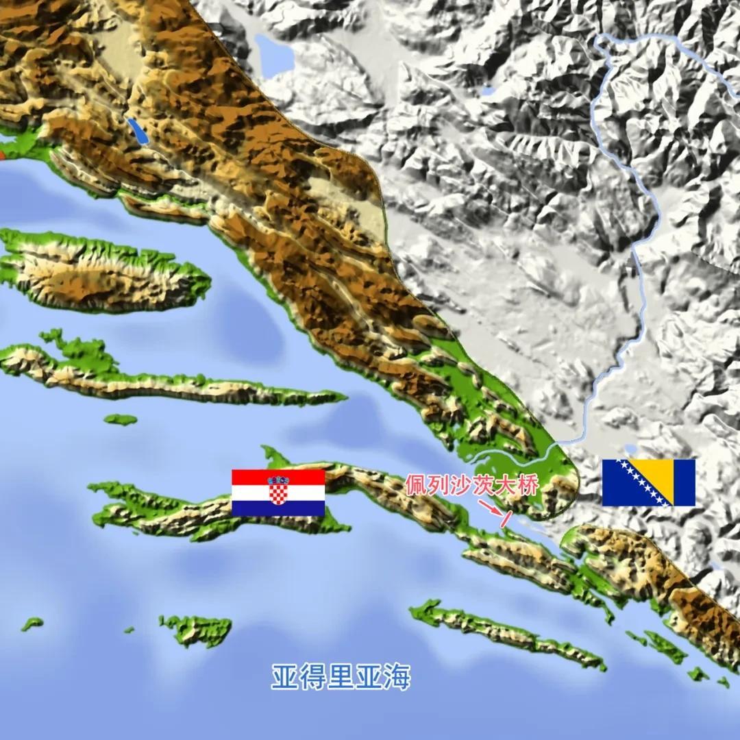 从地图上看,克罗地亚的海岸线把波黑包裹了起来,不放大看我们还以为波黑真是内陆国呢!然而在紧邻佩列沙茨半岛的地方,克罗地亚给波黑留下21.2千米的海岸线,可以进入亚得里亚海,但又修了佩列沙茨大桥,将波黑的出海口锁住。