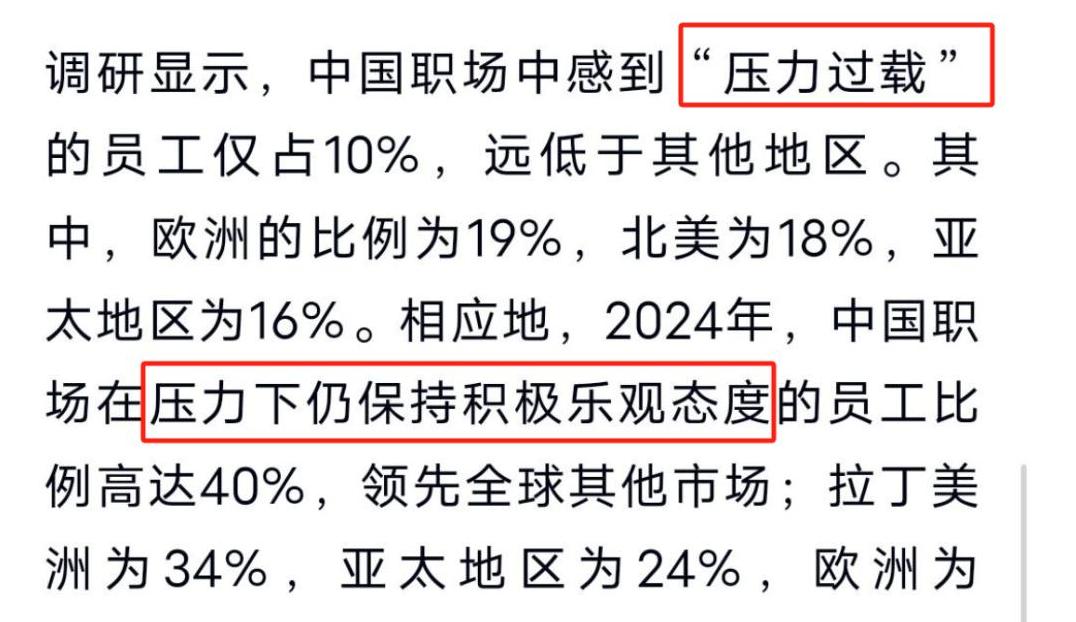 这个报告还声称,在2024年,中国职场上保持积极乐观态度的员工比例高达40%,远超全球其他市场。