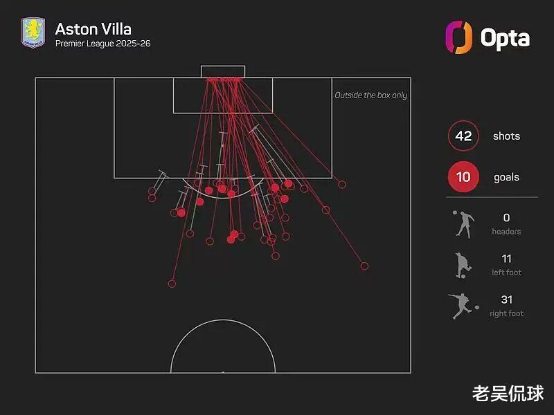 其次,维拉的进攻体系从赛季初的4场颗粒无收到现在火力全开,已经全面激活。在最初的几场胜利中,维拉更多的是依靠禁区外远射得分,他们迄今为止已经在禁区外打入10粒远射进球,是英超最多的球队。但近期的几场胜仗,球队更多开始在禁区内得分,单是近3场胜仗,他们就创造了6粒禁区内的运动战进球。