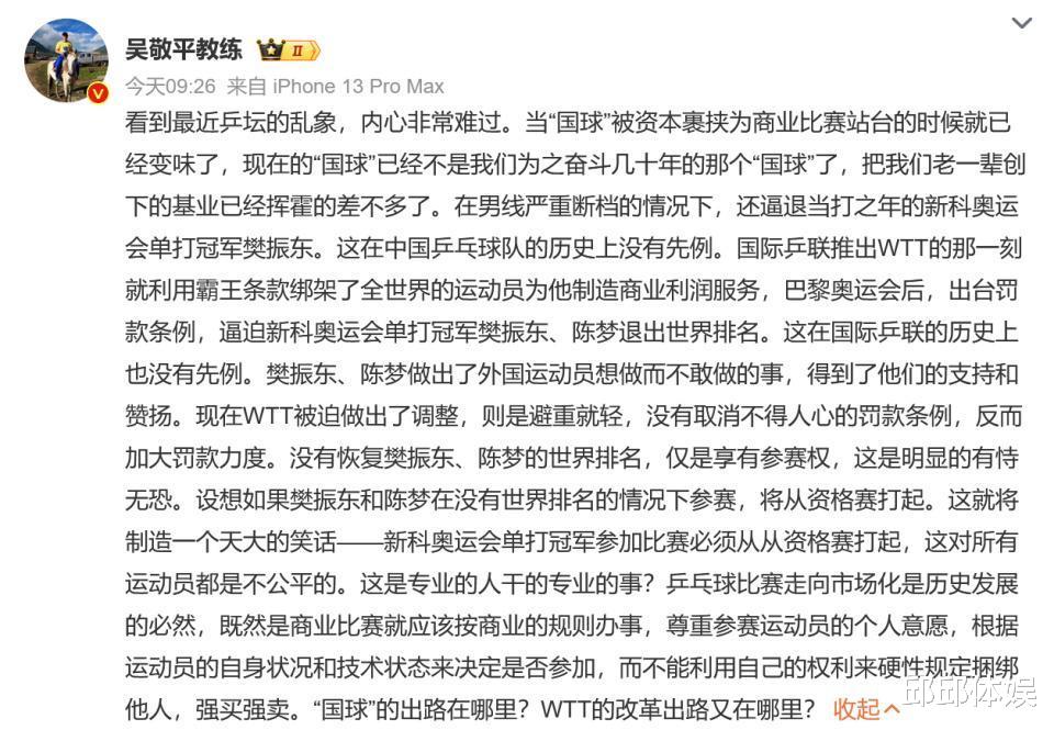 0岁的国乒功勋教练吴敬平近期在社交媒体发布长文,痛陈中国乒乓球正被资本裹挟,导致“国球变味”,他直指国际乒联(ITTF)主导的WTT(世界乒乓球职业大联盟)赛制存在“霸王条款”,迫使樊振东、陈梦等奥运冠军退出世界排名,并批评国乒管理层挥霍老一辈积累的基业,导致男队青黄不接。此文迅速引爆舆论,短短24小时内,包括尹肖、王皓、马琳、张继科、陈玘等新老国乒核心人物纷纷表态,形成罕见的公开对立局面。