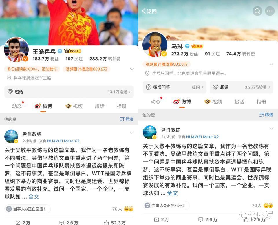 吴敬平的言论也获得了不少球迷的支持,但作为刘国梁的恩师,尹肖则率先站出来发表了不同的意见,称吴敬平“颠倒黑白”,认为WTT是职业化发展的必要补充,其规则调整已体现诚意,而“资本逼退运动员”的指控不符事实,甚至是对年轻一代努力的侮辱。甚至尹肖海搬出了国乒这些年取得的成绩,来回击吴敬平的言论。他认为“从2003年到现在,中国男乒在世界锦标赛上拿了11连冠,6届奥运会一共拿了24块金牌,这样的成绩怎么能说是“挥霍光了基业”呢?”