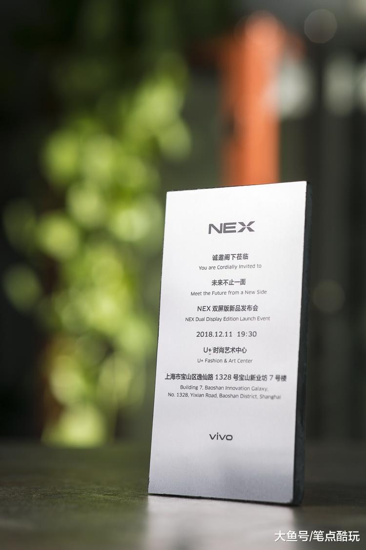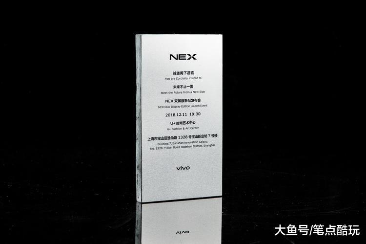 未来不止一面,vivo NEX双屏版新品发布会时间已经确定为12月11日,刚刚曝光的实体邀请函格外引人注目,从邀请函曝光照片可以看到,一面凹凸不平的仿佛来自天外陨石,并刻有NEX字样,另一面则完全光滑,并印有NEX双屏版发布会具体信息,很容易让人联想到vivo NEX双屏版环形光环的神秘,对于这款充满科技感的vivo新旗舰,你期待吗?