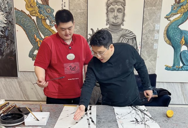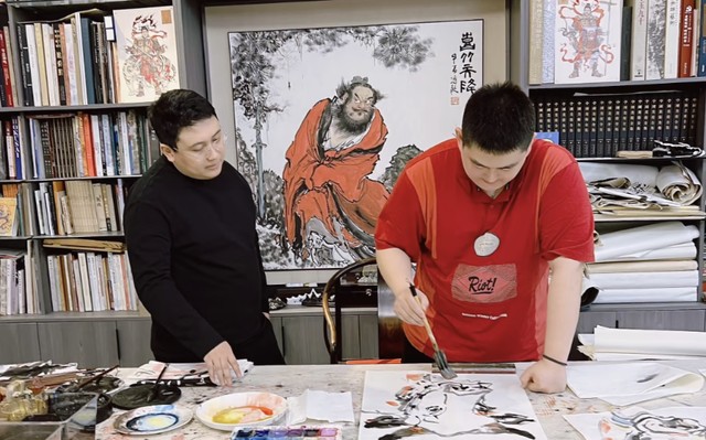 一旁的赵一楠也人真的听着,仔细观察师傅临摹的过程。