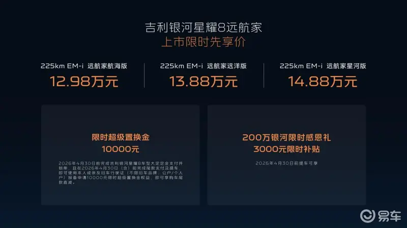 作为品牌布局中高级电混轿车市场的旗舰之作,吉利银河星耀8上市仅8个月勇夺2025年度中国中高级插混轿车销量冠军,并于2026年1-3月连续蝉联月度销量冠军。凭借全面跃升的五大旗舰实力,星耀8远航家将为中高级轿车用户带来更具价值的选择,站在品牌200万销量的新起点上,继续以越级的豪华体验,陪伴更多用户共赴美好生活新程!