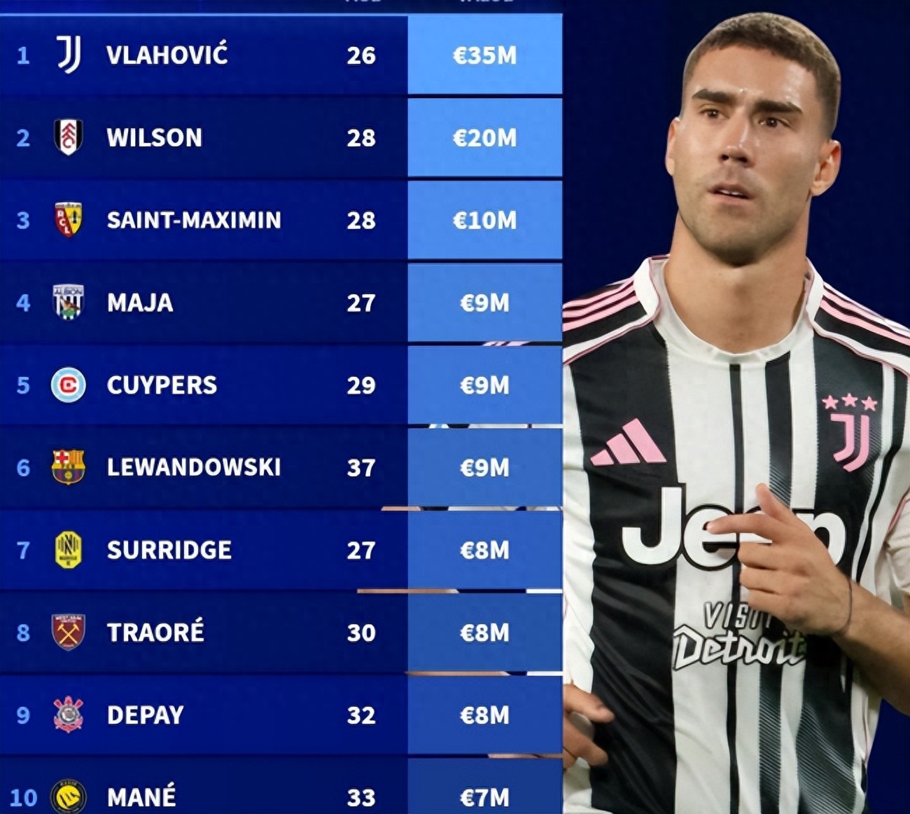 这10名即将恢复自由身的前锋分别是:弗拉霍维奇、哈里-威尔逊、圣马克西曼、乔希-马亚、屈佩尔、莱万多夫斯基、瑟里奇、阿达玛-特拉奥雷、德佩、马内。