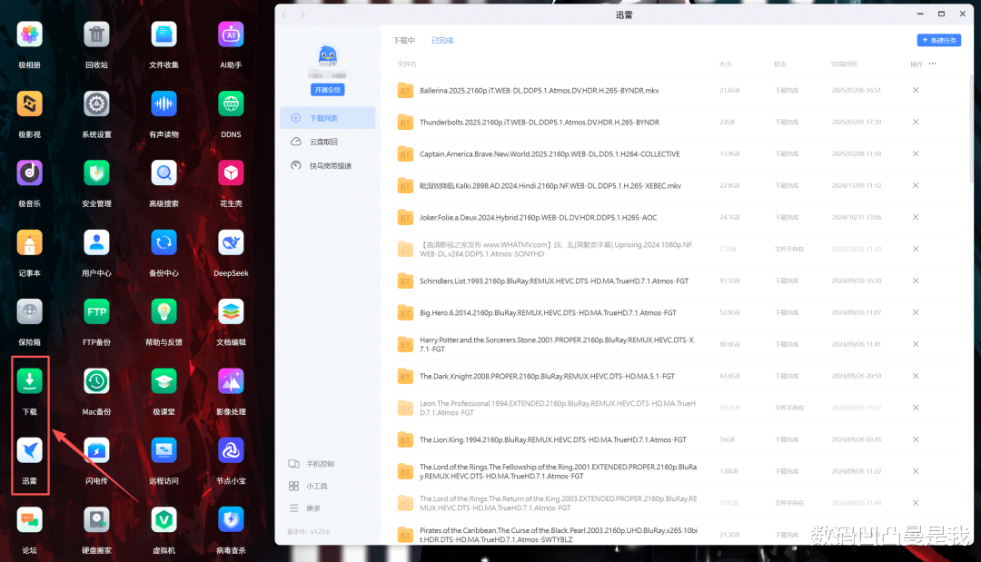 多形式下载,迅雷和网盘直接用玩NAS少不了下载工具,极空间自带可作为PT下载的下载工具以及NAS版迅雷,都是开机就能用,不需要什么其他设置,基本可以满足日常的下载需求了。