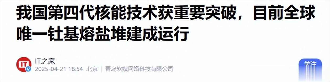 IT之家——我国第四代核能技术获重要突破,目前全球唯一钍基熔盐堆建成运行 2025-04-21