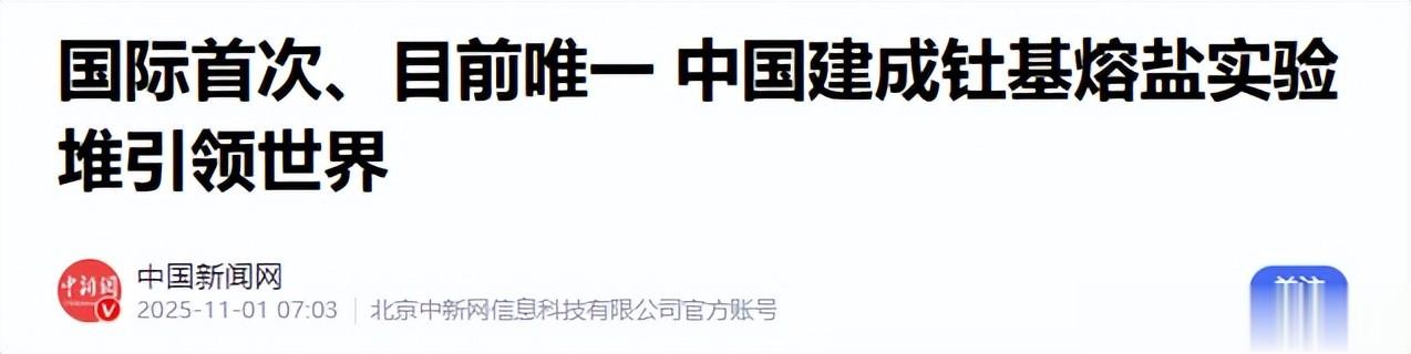 参考资料:中国新闻网——国际首次、目前唯一 中国建成钍基熔盐实验堆引领世界 2025-11-01