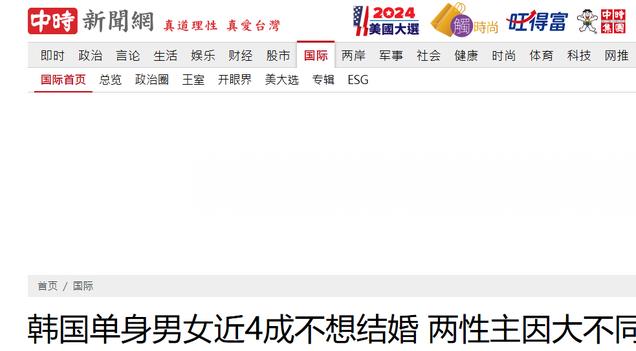 信息来源:中时新闻网-《韩国单身男女近4成不想结婚 两性主因大不同》