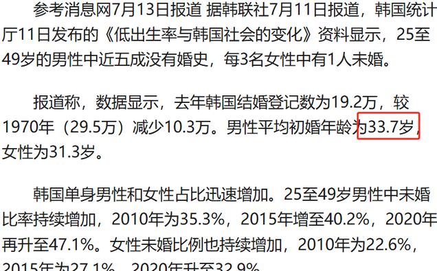 现在韩国男性的初婚平均年龄已经达到了34岁,这一数字已经远远超过了日本,甚至比某些西方国家还要高。