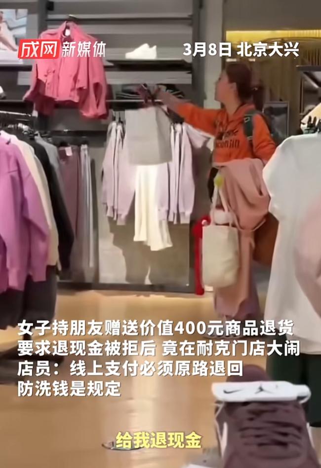 事情发生在近日北京大兴一家耐克门店内,这天一位穿着橘色上衣,粉色长裙的女子都进店内,进店后直接将一件价值400元的商品和购物小票递给工作人员要求退货。