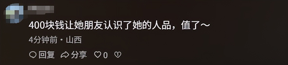 还有的网友说:女子的朋友应该挺庆幸的,用400块钱知道了女子的人品。