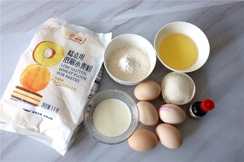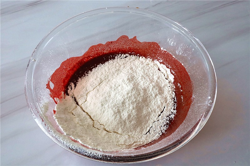 食材:低筋面粉 60克,鸡蛋 5个,牛奶 40克,玉米油 50克,细砂糖 50克,红丝绒液10克。