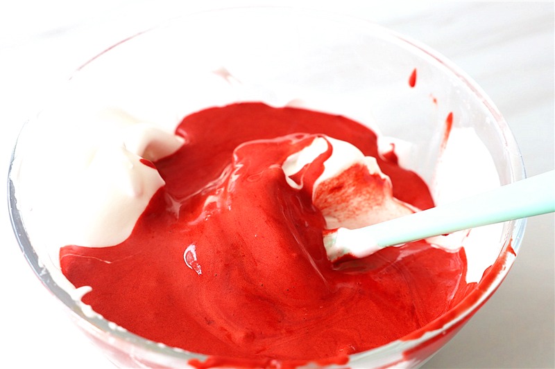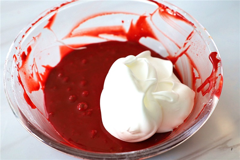 8.取三分之一蛋白霜到红丝绒面糊里,翻拌均匀。