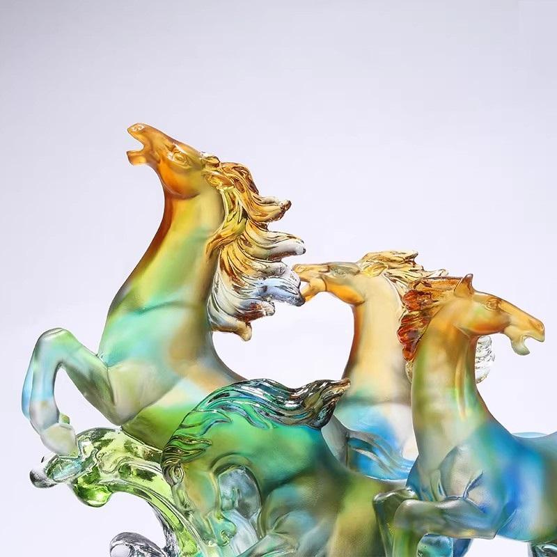 待冷却拆模后,得到的只是琉璃粗胚,还需匠人进行细致入微的修整、研磨和抛光。经过反复打磨,琉璃的光泽才会逐渐透射出来,呈现出晶莹剔透的质感。在这一过程中,匠人们凭借着精湛的技艺和十足的耐心,对骏马的每一个细节,如肌肉的起伏、鬃毛的飘逸、马蹄的刚劲,都进行精心雕琢,让每一匹骏马都仿佛被赋予了生命,从静态的摆件中跃然而出 。