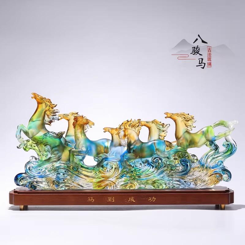当这八骏以古法琉璃的形式呈现,不仅是艺术的创新,更是文化寓意的升华。琉璃的晶莹剔透,让八骏仿佛从历史中奔腾而来,带着灵动的气息和美好的期许,将传统文化的魅力与现代艺术的美感完美融合,让人们在欣赏摆件的同时,也能感受到那份深厚的文化底蕴和对美好生活的憧憬 。