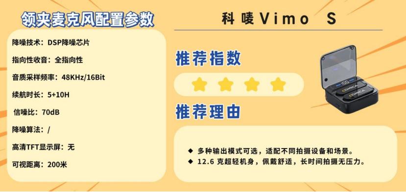 科唛Vimo S遵循“小而精”设计,10g超轻机身长时间佩戴无坠感,金属质感扎实耐用。全指向高保真咪头搭配48kHz专业采样率,音质清晰,双档降噪过滤空调、电脑等环境杂音,室内创作无需复杂后期。磁吸充电仓带智能数显,总续航满足全天拍摄;即插即用,兼容手机、相机多设备,配件齐全无需额外购置转接头。定价适中,虽人声质感略逊旗舰款,但日常Vlog、网课录制等场景中,轻量化与实用性平衡出色。