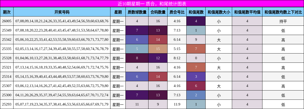 下图展示了近10期星期一的质合与和尾走势。可以看到,合数在多数期次中占据主导,质数则呈现间歇性低开,形成明显的冷热交替特征。这种波动性为本期质数的适度回归提供了数据支撑。