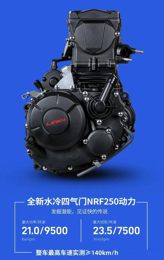 虽然价格便宜,但此车的发动机可不简单。搭载的是一台自研的249.2cc单缸SOHC四气门水冷发动机,缸径行程为77/53.6mm,压缩比11.8:1,配备国际六档变速箱,搭配滑动离合器。最大功率21kW/9500rmp,最大扭矩22N.m/7500rmp,折合马力28.6Ps,极速可达140km/h。这个数据在单缸250里已经是非常不错的表现,仅比春风250SR弱一点,但价格却差了大几千块。