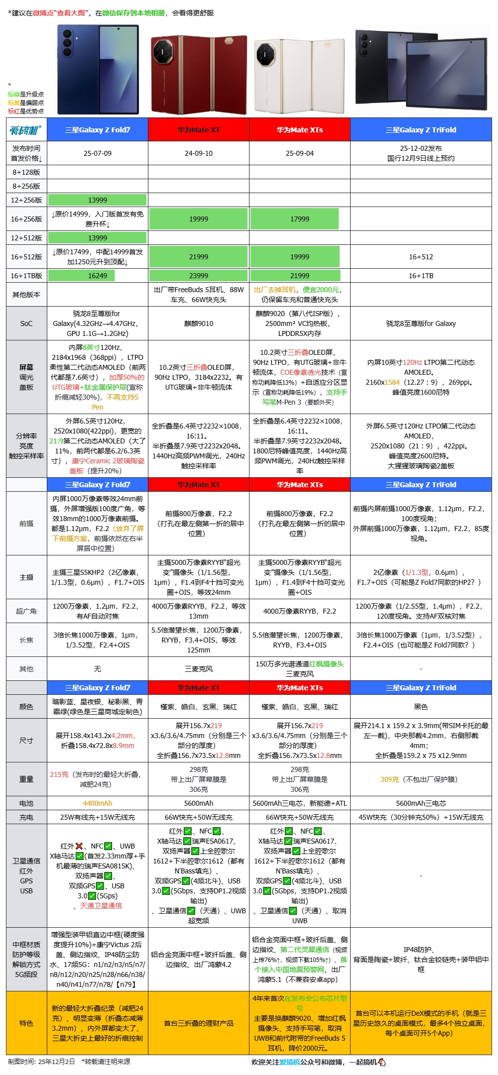 例牌,【三星Galaxy Z TriFold三折叠】,与华为Mate XTs三折叠、三星Galaxy Z Fold7大折叠对比↑。