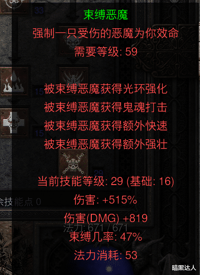 “束缚恶魔”根据技能等级(主动加点或装备加成均可)可使恶魔额外获得强化属性,分别为:
