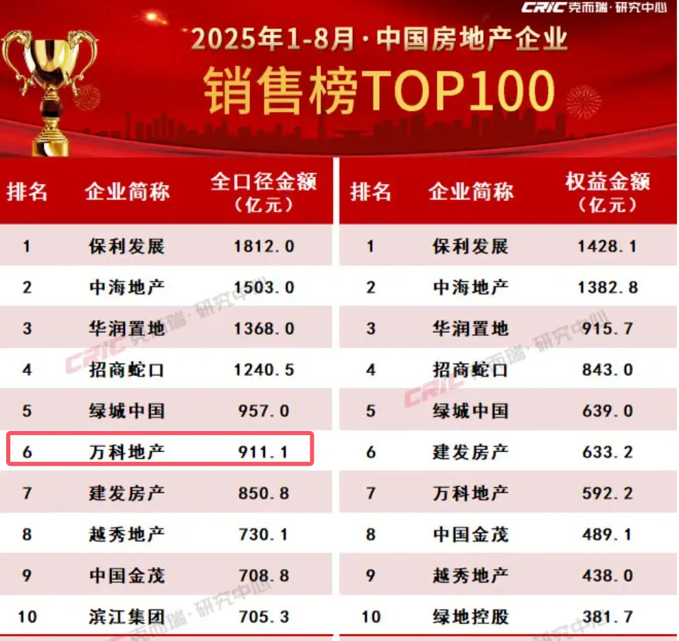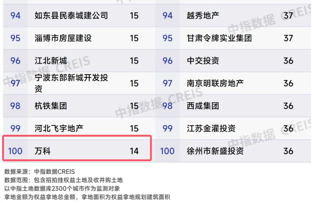 这种趋势下,万科近年来也很少在市场上拿地了。中指的数据就显示,今年1-8月份,万科权益拿地金额只有14亿,排名全国第100。