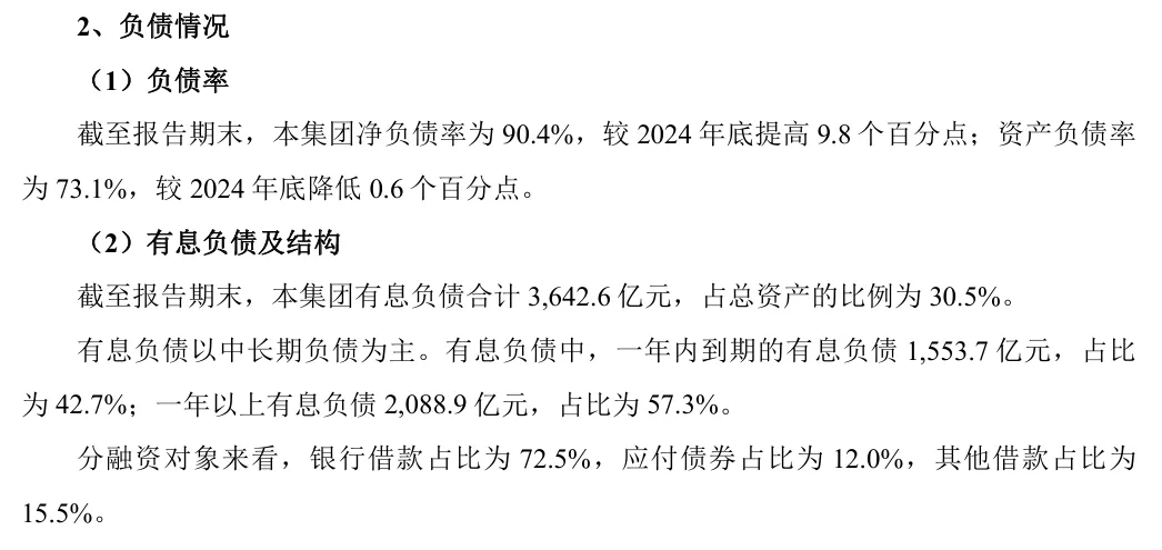 根据万科发布的2025中报,截至报告期末,万科有息负债合计3,642.6亿元,一年内到期的就有1553.7亿元,占比高达42.7%。