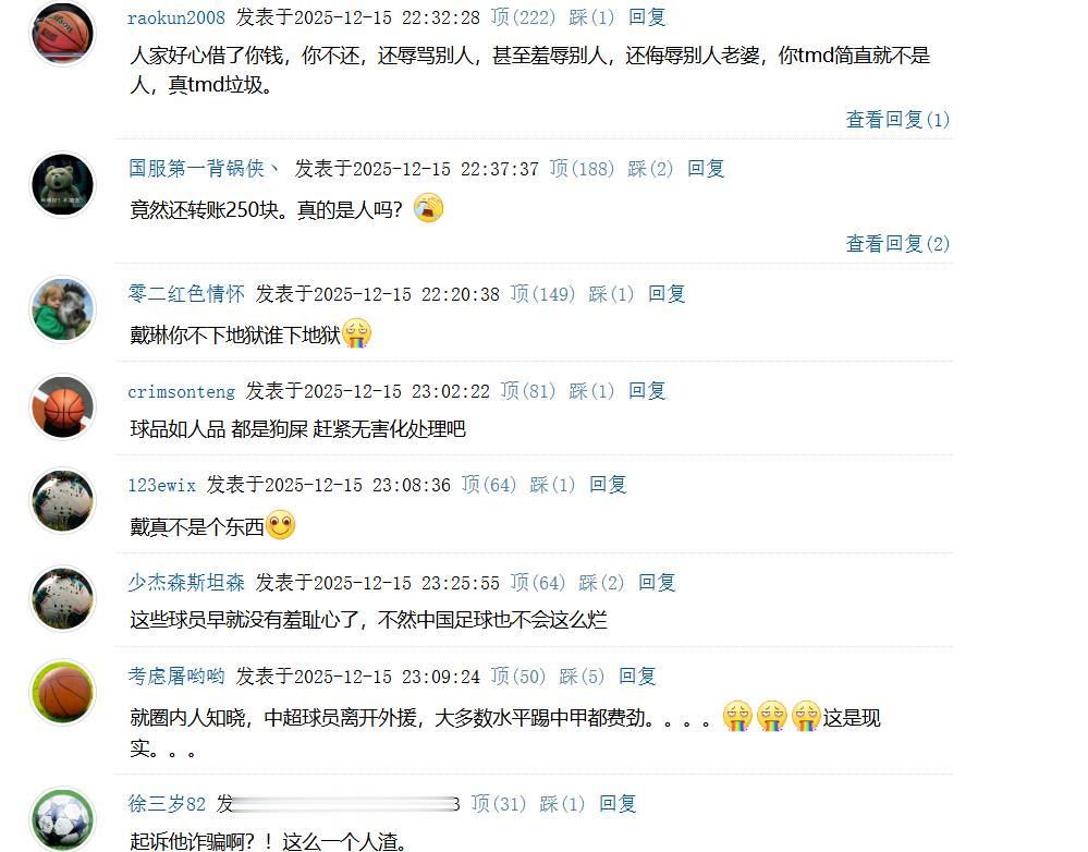截止到小编码字时为止,戴琳尚未做出回应。不过,在网友评论区,球迷怒不可遏。有网友说:“球品如人品, 都是狗屎, 赶紧无害化处理吧。”还有球迷说:这些球员早就没有羞耻心了,不然中国足球也不会这么烂。也有球迷表示:戴琳这样的人居然曾经入选国家队,滑天下之大稽。