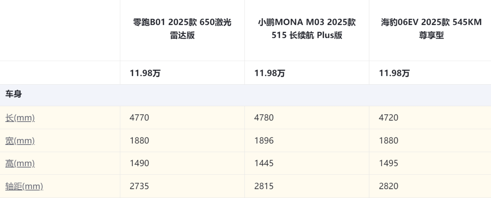 咱们选择的车型都卡在12万内,而这三款车型都有11.98万的版本,其中M03是2025款515长续航Plus版,海豹06EW是2025款545千米尊享型,零跑B01是2025款650激光雷达版。在价格完全一样的情况下,这三者的配置可以说是参差不齐,其中配置最低的自然是M03,B01的配置是最高的。在车轮制动方面,B01的规格最高,225 18寸轮胎,视觉效果以及实际的功能性都更好,海豹06EV只有17寸,而M03偏窄为215的宽度。在主动安全方面,海豹06EV比M03多出了前方交通穿行预警以及前方交通穿行制动还有道路交通标识识别,而B01在此基础之上还多了一个信号灯识别。而且由于零跑B01搭配了三辆车中仅有的激光雷达,所以它有高速路段和城市路段的导航辅助驾驶能力,甚至还有好用的记忆泊车功能。